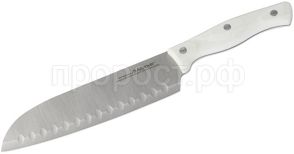 Форма ножа делает его подходящим для быстрой нарезки зелени, мяса, овощей. Нож сантоку прекрасно сбалансирован, имеет эргономичную ручку, которая удобно лежит в руке. Ручка из прочного пластика зафиксирована дополнительными болтами.